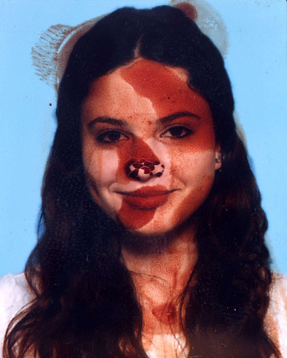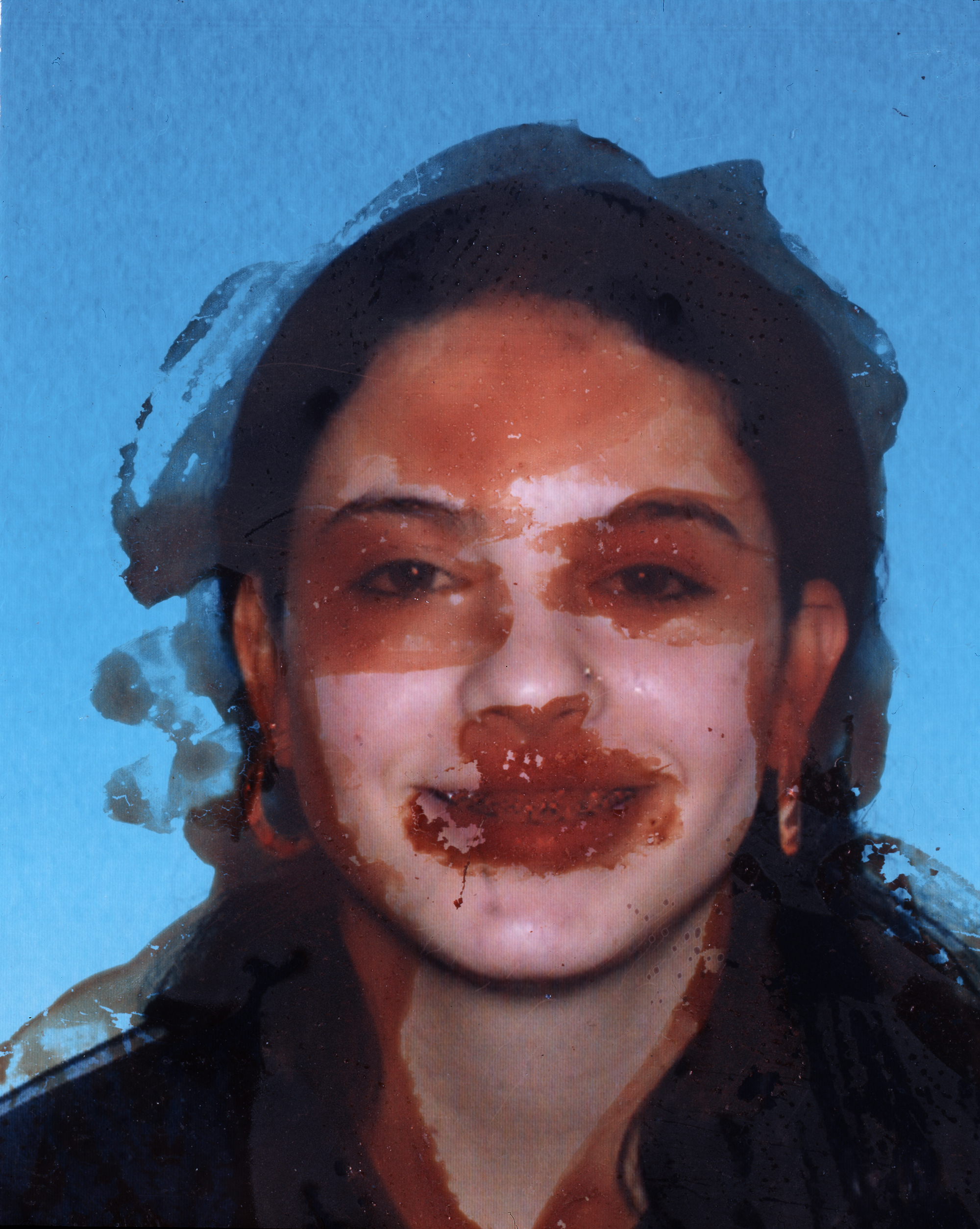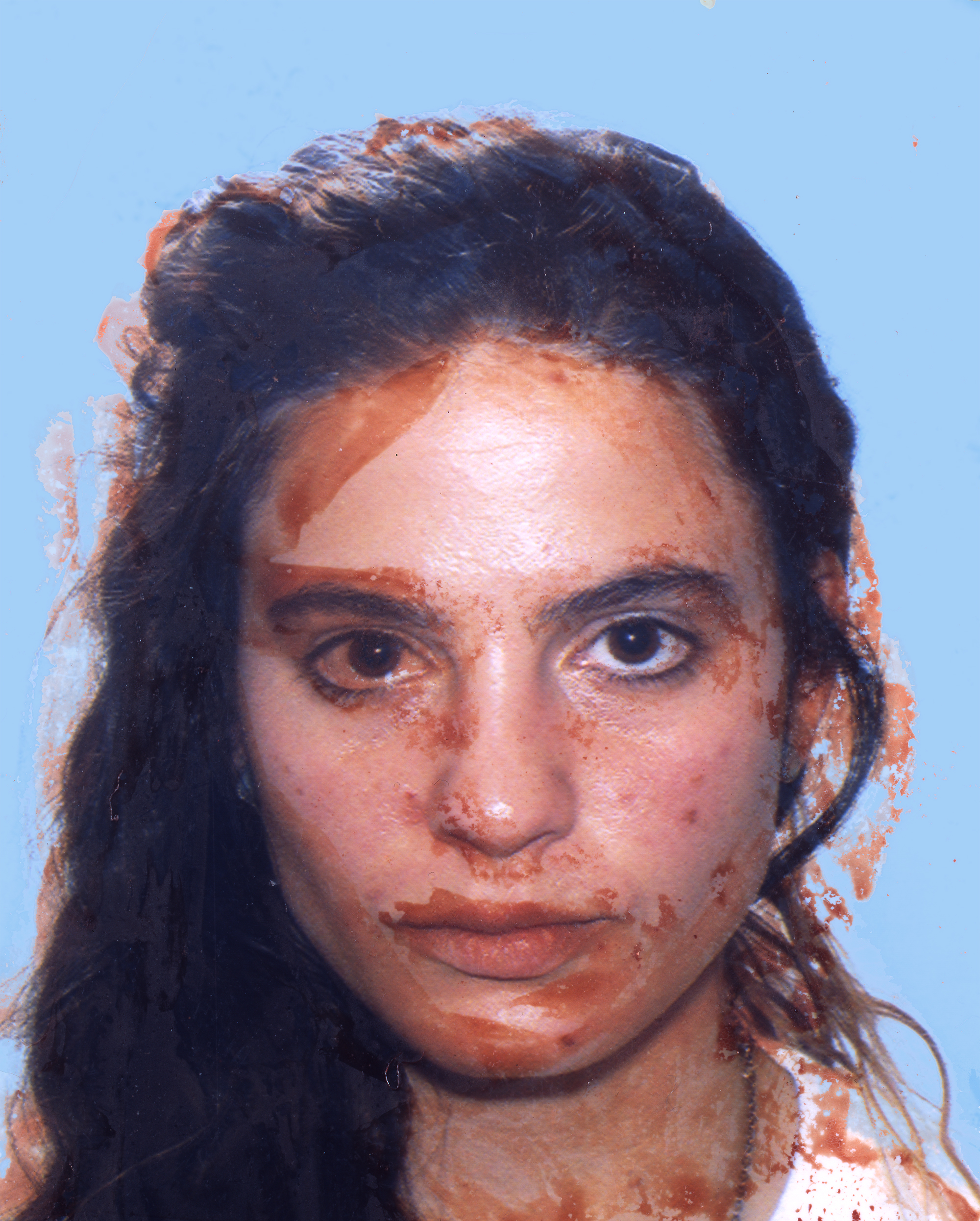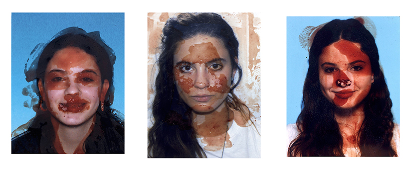 After drawing blood from my left arm, I pressed my bloody finger onto three passport photos from different periods in my life, then I photographed them with a 4X5 camera.